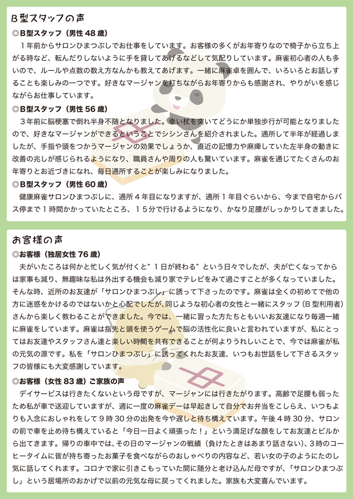 説明 | 健康麻雀 サロンひまつぶしの集客用チラシです。これまでのチラシやホームページのデザインを踏襲しました。 |